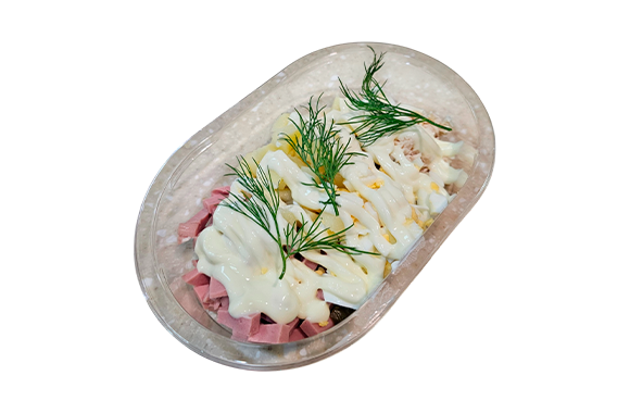 Состав: филе цыпленка-бройлера, колбаса вареная, картофель отварной, огурец свежий, яйцо отварное, соус майонезный, зелень свежая.