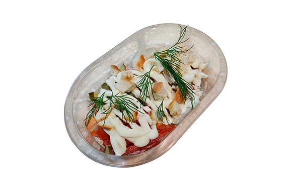 Состав: филе цыпленка-бройлера, ветчина, огурец свежий, томат свежий, лук маринованный, соус майонезный, сухарики.