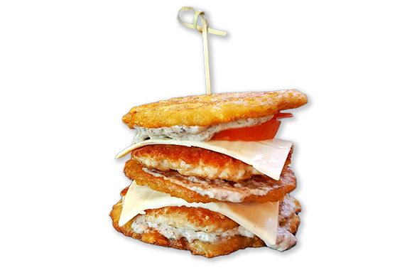 Состав – Картофельные оладьи п/ф, котлеты из птицы, соус грибной, лук маринованный, томат свежий, сыр сливочный ломтики