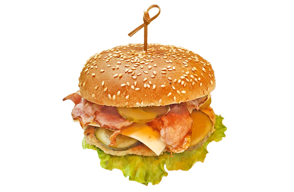 Состав: булочка для гамбургера, котлета из птицы, томат, сыр, салат Айсберг, огурцы соленые, копчености из свинины, соус Цезарио
