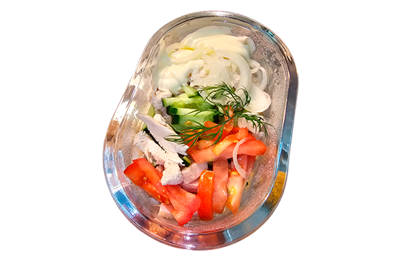 Состав: филе цыпленка-бройлера, огурец свежий, соус майонезный, томат свежий, лук репчатый, зелень свежая, соль йодированная, уксус спиртовой, масло растительное.