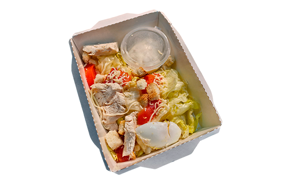 Салат айсберг, филе цыпленка, соус "Цезарио",томат, яйцо куриное, сыр твердый, сухарики, зелень.